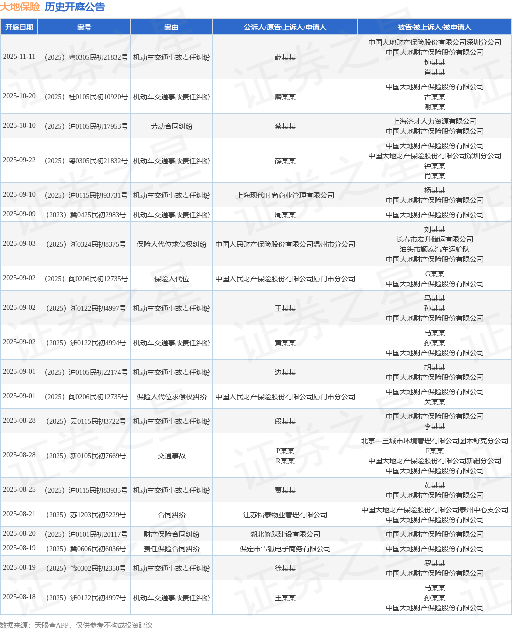 本站消息,根据天眼查APP显示,近日公布了一则中国大地财产保险股份有限公司作为被告/被上诉人的开庭公告,详细内容如下: